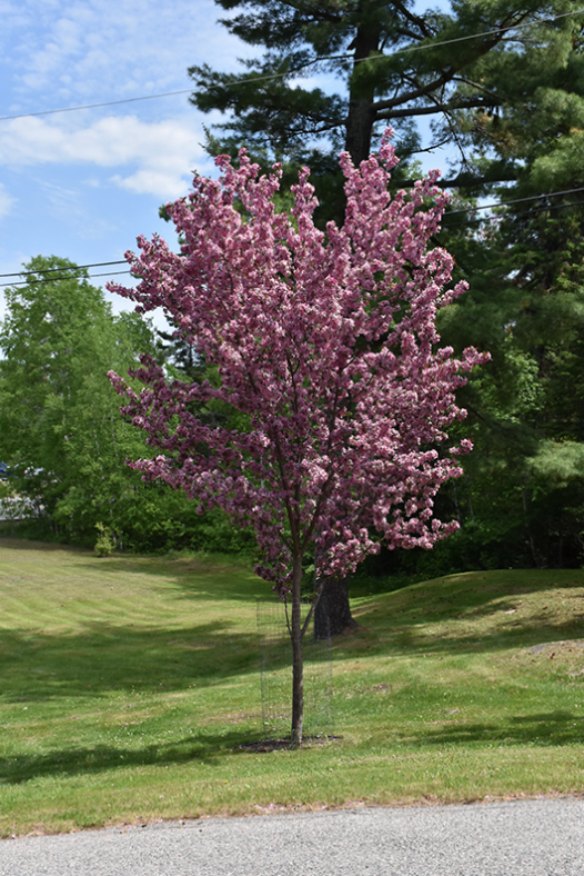 A beautiful and hardy cultivar with an upward narrow habit; covered in deep pink blooms in spring; fruit is dark red, small and persistent and adds ornamental value for fall and winter; an excellent street tree; highly disease resistant