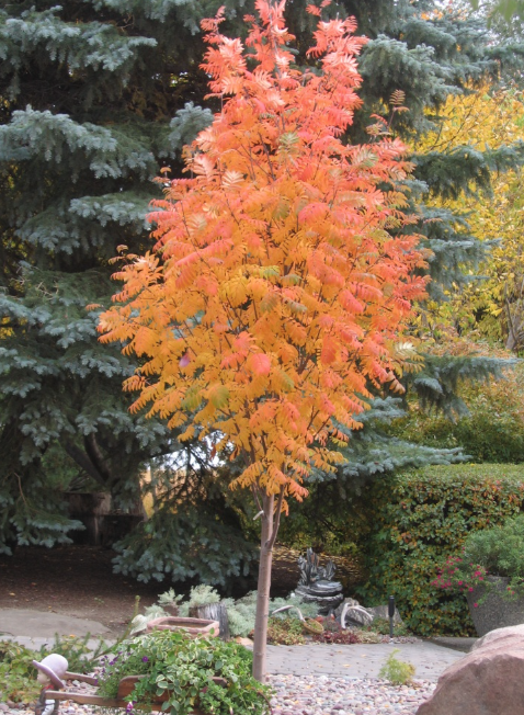 A dashing small accent tree for the home landscape with fluffy white flowers in spring followed by large clusters of orange fruit lasting into winter; shiny olive bark, attractive compound leaves turn orange and red in fall; needs well drained soil.