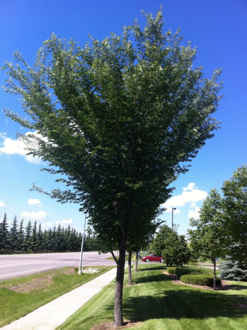 An extremely hardy and adaptable shade tree with an upright vase-shaped habit of growth and a very dense ascending branch structure, smaller than the massive American elm and a better choice for home landscapes; do not use where DED is a known problem.