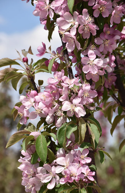 A lovely columnar cultivar with brilliant fuschia and white blossoms in spring; fruit is light green, tiny and persistent, and adds decorative value in autumn and winter. excellent disease resistance