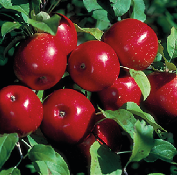 A hardy red apple with a yellow blush and a hint of tartness, keeps very well, late harvest; eating apples are high maintenance and need a second pollinator; the perfect combination of accent and fruit tree, needs well-drained soil and full sun.