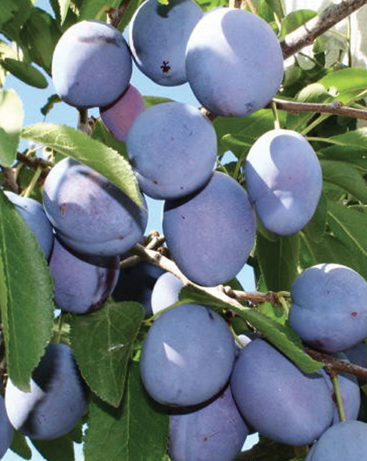 A popular hardy fruit tree with showy fragrant white flowers in spring and loads of tasty blue prune-plums in late summer; an open, spreading tree, quite ornamental; needs full sun, well-drained soil and a pollinator.