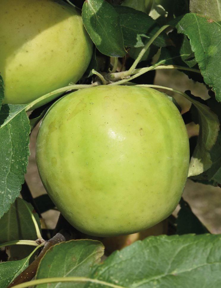 A very hardy and juicy scarlet-striped yellow apple, keeps well, late harvest; eating apples are high maintenance and need a second pollinator; the perfect combination of accent and fruit tree, needs well-drained soil and full sun.