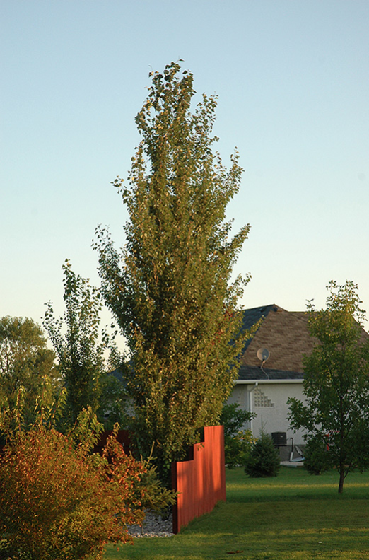 An extremely tall and narrow pencil-like tree, used primarily as a sharp vertical accent or in a row as a very tall screen; fast growing, more disease resistant than Lombardy poplar, tends to sucker with age; one of the toughest of all columnar trees.