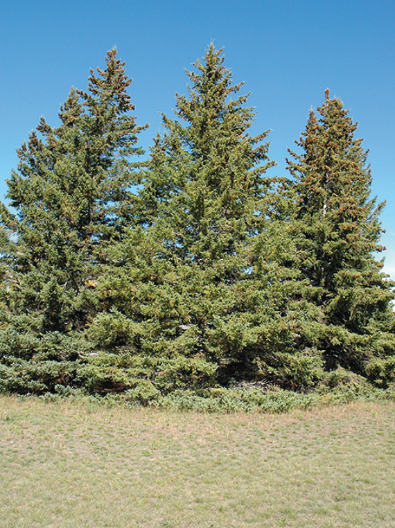 The hardiest of the landscape spruces, tall and stately with bluish-green needles; very tough and adaptable to all kinds of soils except those that are permanently wet, makes a stunning vertical accent in the larger home landscape or a fine windbreak